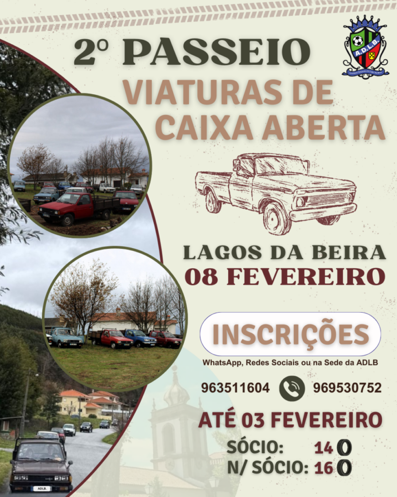 A Associação Desportiva de Lagos da Beira, no concelho de Oliveira do Hospital, vai realizar no próximo dia 8 de fevereiro (domingo) o 2º Passeio de Viaturas de Caixa Aberta.