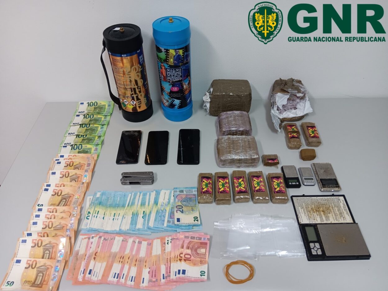 No âmbito de uma investigação por tráfico de estupefacientes, os militares da Guarda desenvolveram diligências policiais que culminaram no cumprimento de um mandado de busca domiciliária, tendo sido apreendido diverso material, entre o qual se destacam: 6 854 doses de haxixe; 3 850 euros em numerário; 231 sacos para acondicionamento de doses individuais de produto estupefaciente; quatro balanças de precisão; quatro telemóveis; duas facas e duas botijas de óxido de nitroso (N₂O).
