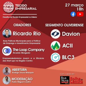 A este encontro digital junta-se ainda Ricardo Morgado, a representar a The Loop Company, uma start-up da região Centro fundada por jovens e focada na economia circular. Deste lado da conversa, vai falar-se de “Empreendedorismo Jovem e sobre a eficácia das start-ups na Região Centro”.