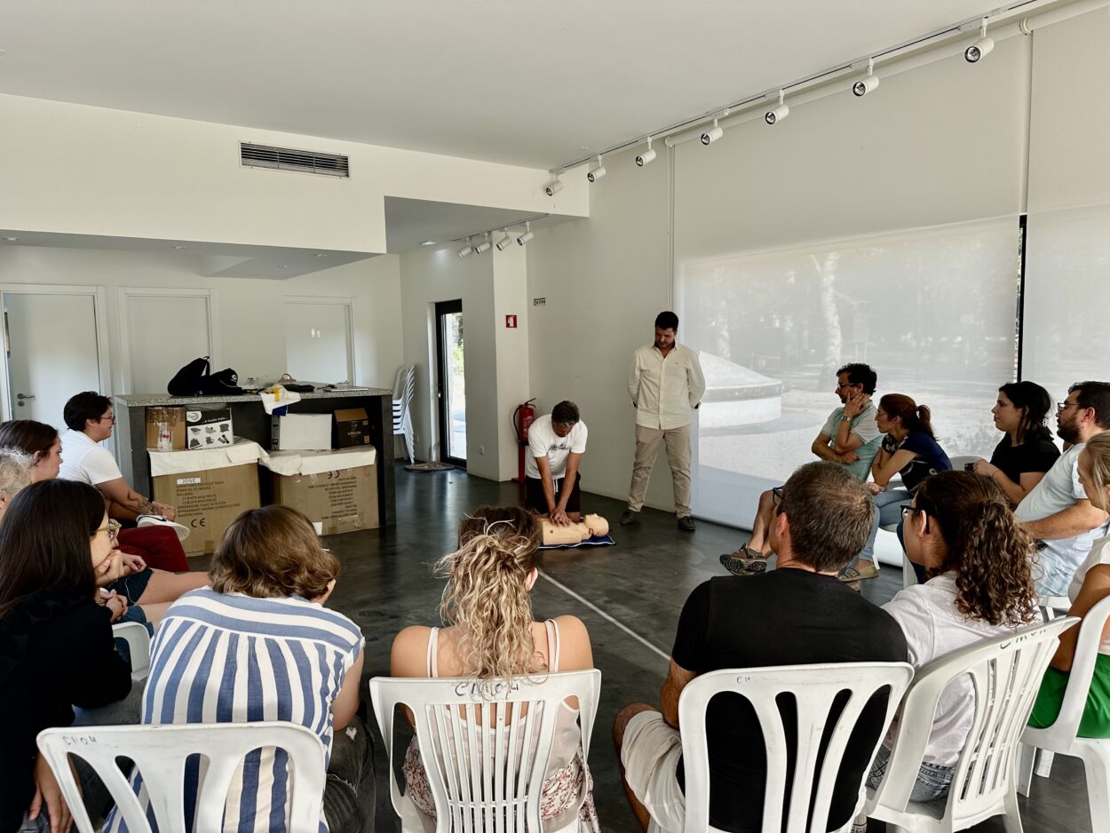 Com a duração de quatro horas, a formação incluiu, numa primeira fase, a apresentação teórica do tema, apoiada por vídeos do INEM. Após um breve lanche, os participantes tiveram a oportunidade de aplicar na prática os conhecimentos adquiridos, treinando procedimentos de primeiros socorros em situações como vítimas inconscientes ou casos de engasgamento.