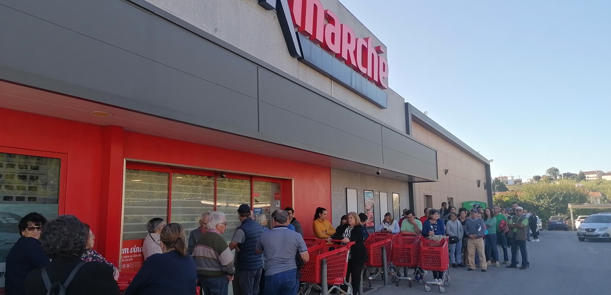 Esta manhã, eram muitos os clientes que faziam fila à porta da loja do grupo Mosqueteiros e que aguardavam pela abertura do espaço, que só veio a acontecer pouco depois das 10h00, para a compra de produtos a preço mais reduzido.