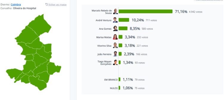 Marcelo Rebelo de Sousa foi, este domingo, o candidato mais votado no concelho de Oliveira do Hospital, no âmbito das eleições presidenciais, conseguindo 71,16 por cento dos votos (4942). O candidato André Ventura (Chega) alcançou no concelho 10,24 por cento da votação (711 votos). Dos 17 631 inscritos, 7099 oliveirenses foram hoje à mesa de voto, sendo a abstenção de 59,74 por cento.