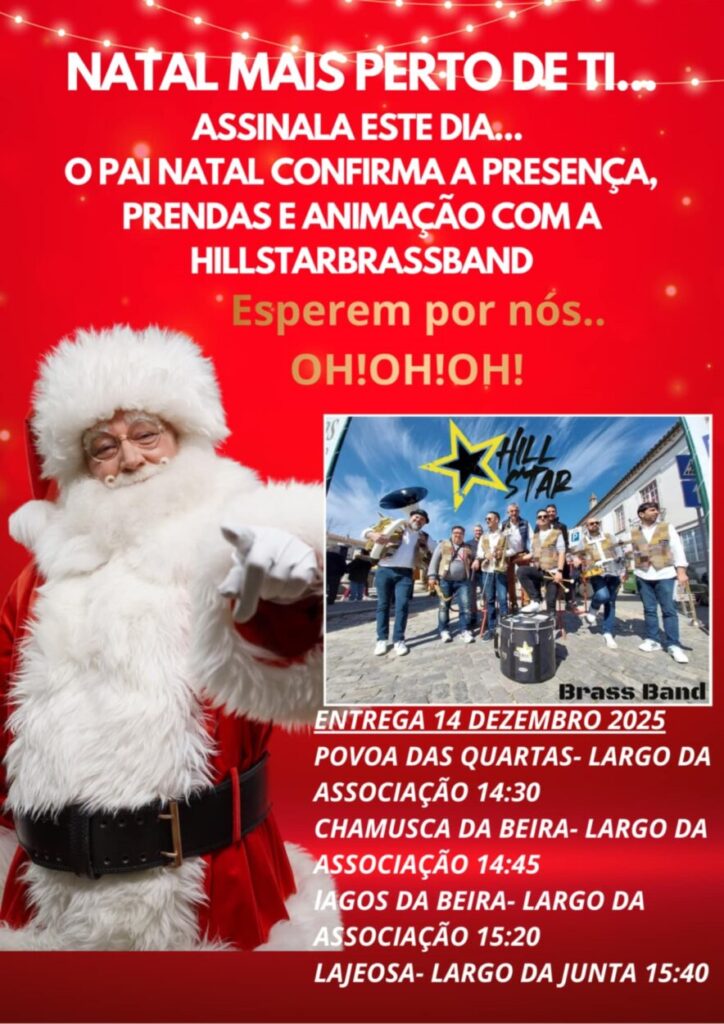 A iniciativa é da União de Freguesias que, este ano, volta a proporcionar a visita do Pai Natal nas várias localidades, com animação a cargo da HillStar Brass Band. Transportado de Buggy, o Pai Natal vai iniciar o seu périplo na Póvoa das Quarta, pelas14h30, com concentração e distribuição dos presentes no Largo da Associação. Dali, segue para o Largo da Associação de Chamusca Beira (14h45), passando depois por Lagos da Beira, no Largo da Associação, onde é esperado às 15h20. A jornada termina na Lajeosa, às 15h40, com entrega de presentes no Largo da Junta.