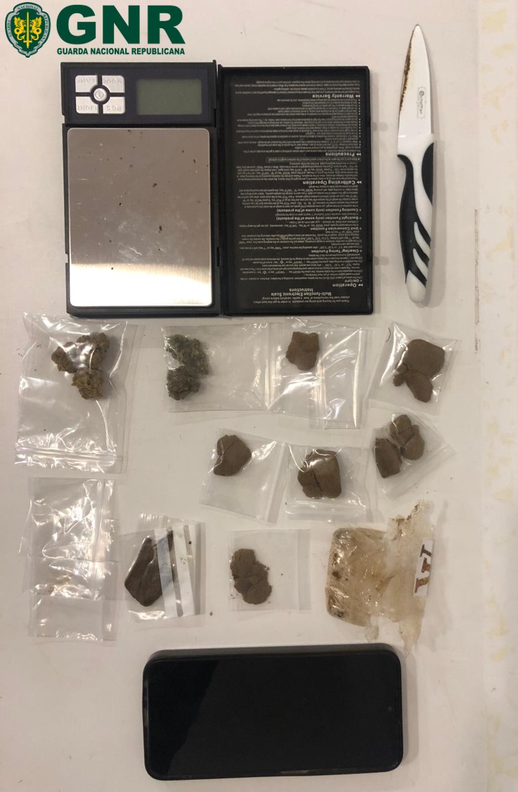 Da ação resultou também a apreensão do 43 doses de haxixe, uma dose de liamba, uma faca, uma balança de precisão, sacos herméticos utilizados no acondicionamento de doses individuais e um telemóvel.