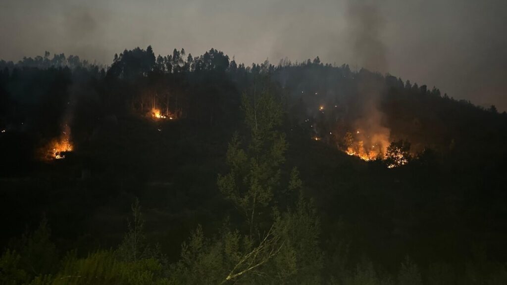 A Frente III – Seia do Incêndio do Piódão mantém-se ativa junto à linha de água entre a Teixeira e a Teixeira de Baixo.