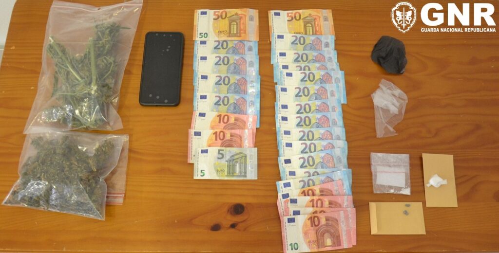 Na ocasião, a GNR apreendeu 11,25 doses de cocaína, 21,62 doses de canábis, um comprimido de MDMA, um telemóvel e 485 euros em numerário.